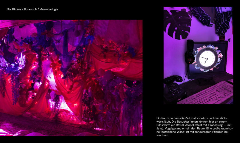 Das Nimmermeer ist ein immersives interaktives Kunstfestival, das die Besucher*innen in fiktive Geschichten eintauchen lässt. In dieser Ausgabe konnten sich die Teilnehmende auf eine Rätseltour begeben, die nach und nach die Tagebucheinträge der Zeitwissenschaftlerin Helea Balsofil offenbahrte. Das Gelände war gestalterisch in verschiedene Bereiche aufgeteilt, in denen sich die Zeit unterschiedlich verhielt: schnell und langsam, vorwärts und rückwärts und Zeit als Illusion – dies wurde vor allem durch interaktive Installationen vermittelt.